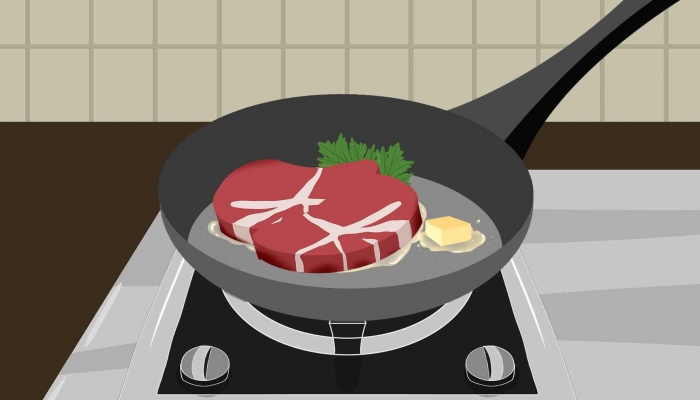 4、锅烧热后,放入牛排大火煎,再改中火煎,直到煎至自己喜爱的熟度,喜欢全熟的可以多煎一会儿。快好的时候放入一小块黄油,再将侧面都煎一下,可能很多人会漏掉这个步骤,煎侧面也叫“锁边”,可以防止牛肉汁水流失。
