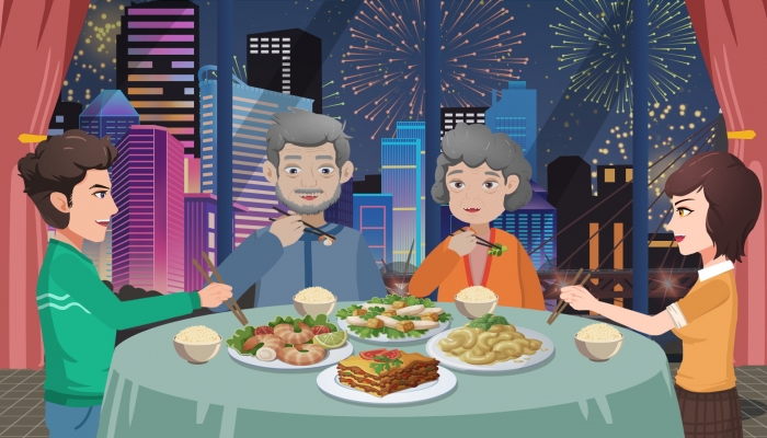 我国早在汉代就有除夕吃团圆饭的习俗。旧时,由于生活水平较低,平时做不到饮食丰厚,只有到了过年时才能改善一下,因此对年夜饭的质量和内容要求较高,饭菜要尽可能丰富,一是为了解馋,二是这种充实感预示着来年的丰衣足食。吃年夜饭也是有一些讲究的。