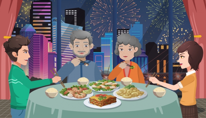 除夕晚上的家宴俗称年夜饭,也叫团圆饭。这时家庭成员要尽可能地齐全,许多远在外地的家庭成员也总要在年夜饭之前赶回家中,因此这顿年夜饭又称“团年”。我国早在汉代就有除夕吃团圆饭的习俗。旧时,由于生活水平较低,平时做不到饮食丰厚,只有到了过年时才能改善一下,因此对年夜饭的质量和内容要求较高,饭菜要尽可能丰富,一是为了解馋,二是这种充实感预示着来年的丰衣足食的。在古代,人们认为年夜饭还有逐疫、驱邪、健身的作用。因此,年夜饭的特点是全家大团圆的宴会,无论男女老幼都要参加,为了这个团圆,外出的家人或子女都要赶在除夕前返回家来,如果没能及时赶回来,餐桌上要给未归人留一个空位,摆一双筷,表示全家团聚。