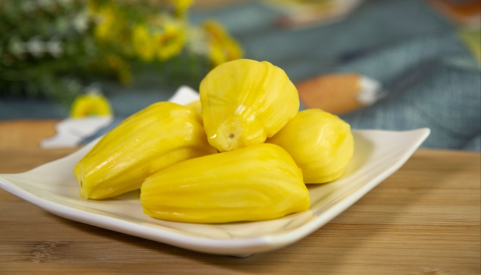2、触感软硬:轻轻按压菠萝蜜的外壳,成熟的果实会感觉有些软,并且有一定的弹性。如果外皮的刺变得软且梢部有些萎缩,而不是尖锐坚硬,这通常意味着果实已成熟。