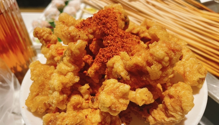装盘与调味:将炸好的小酥肉装盘,撒上适量的花椒粉、椒盐粉、辣椒粉等调料(根据个人口味选择),即可食用。也可以将小酥肉与其他食材一起炖煮或涮火锅,增加风味和口感。