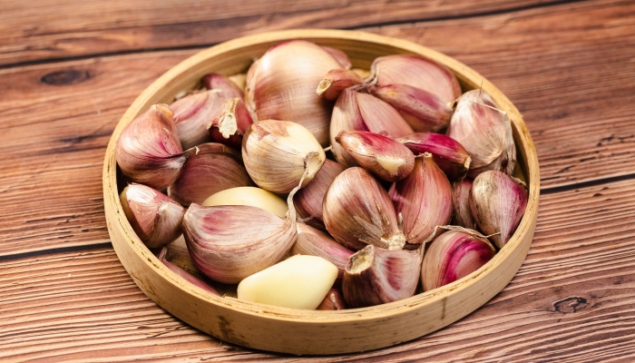 3、去皮:将紫皮蒜的外皮剥去,注意不要损伤蒜瓣,以免腌制时变质。