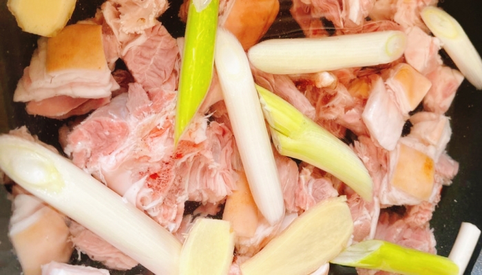 2、焯水法:把羊肉块放入加了姜片和料酒的冷水中,大火烧开后撇去浮沫,焯水3-5分钟,捞出用温水冲洗。
