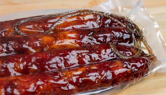 3、观察肠衣厚薄:腊肠的外皮越薄越好,若是外皮变得非常脆,则代表腊肠保存有问题,已经变质了